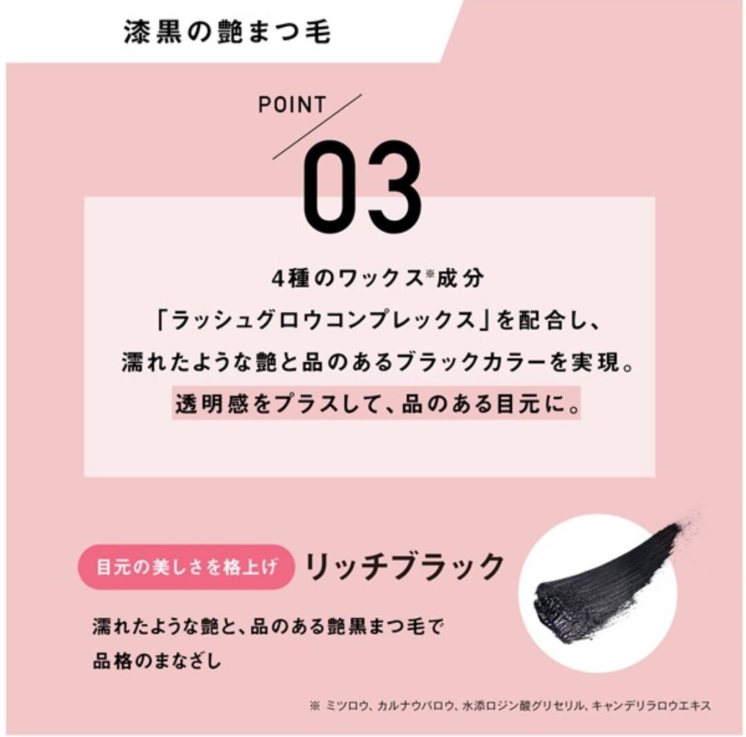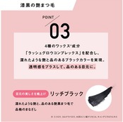 艶やかな漆黒ブラックが瞳のフレームを際立たせ、品のある眼差しに。9種の美容液成分(保湿)とパンテノール(毛髪補修成分)が配合されています。